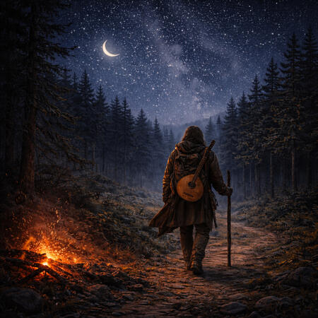 After a long day threading the forest paths, the traveler, his wife, and their son come upon a communal fire where roads and stories meet. Bowls are passed, names are traded, and then a flute lifts the night: “Danza del Oso”, an old Iberian tune that sets boots tapping. A circle forms and widens as more travelers step in; someone calls an airy An Dro from Brittany, the steps turning like millstones. Laughter rises; Irish reels spark, old-country melodies that run as quick as feet, as sure as heartbeat.